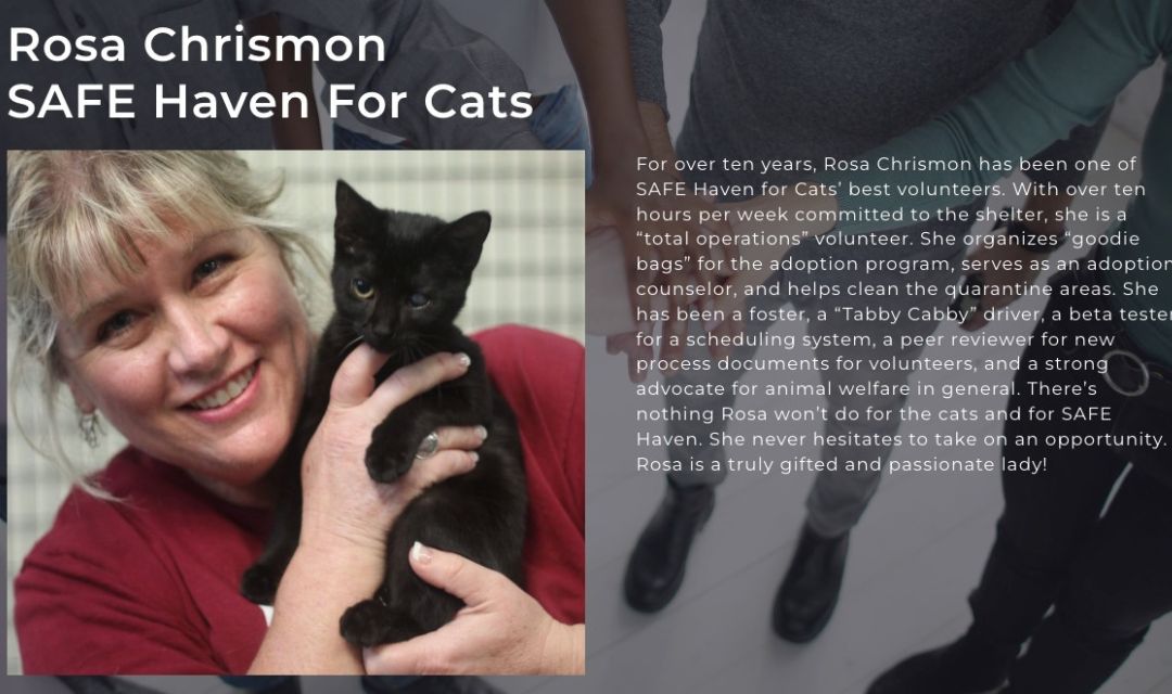 For over ten years, Rosa Chrismon has been one of SAFE Haven for Cats’ best volunteers. With over ten hours per week committed to the shelter, she is a “total operations” volunteer. She organizes “goodie bags” for the adoption program, serves as an adoption counselor, and helps clean the quarantine areas. She has been a foster, a “Tabby Cabby” driver, a beta tester for a scheduling system, a peer reviewer for new process documents for volunteers, and a strong advocate for animal welfare in general. There’s nothing Rosa won’t do for the cats and for SAFE Haven. She never hesitates to take on an opportunity. Rosa is a truly gifted and passionate lady!